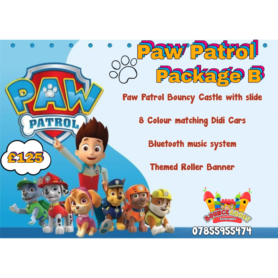 Newark bouncy castle hire Package B- Paw Patrol Castle with 8 Didi Cras and music in Newark, Balderton, Coddington, Farndon, Elston, Collingham, Winthorpe, and local villages is the ultimate kids’ party solution. This all-in-one hire combines a themed Paw Patrol bouncy castle, Bluetooth music system, 8 Didi cars and a Paw Patrol roller banner to keep children engaged and smiling from start to finish. Ideal for children’s birthday parties and family events. 🐾🎶
