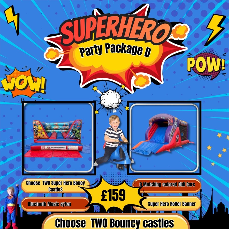 Deliver an unforgettable kids' party with our Super Hero Bouncy Castle hire SUPER HERO - Package D in Newark, Nottinghamshire, Lincolnshire. Fast setup. Safe equipment. Two themed Super Hero Bouncy castles prevent overcrowding and keep energy high. Ideal for birthday parties, school events, and community functions. This package is a top Indoor Party Package choice for parents and event planners. 🦸♂️🦸♀️
