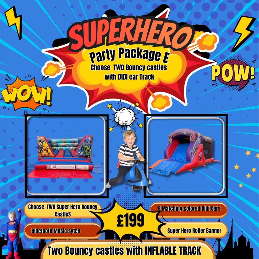 Bouncy castle hire SUPER HERO - Package E Two Bouncycastle snd Didi Car Track in Newark, Nottinghamshire, Lincolnshire delivers high-impact fun for big events. This all-in-one bundle includes two SuperHero bouncy castles, an Inflatable Didi Car Track with eight ride-on cars, a Bluetooth Music system, and a themed roller banner. Perfect for community halls, and large birthday parties. 🎉