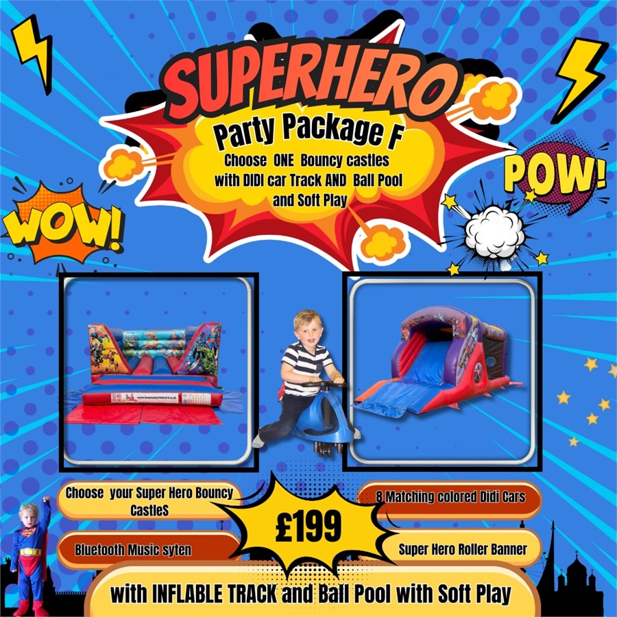 Super Hero party made simple. 🎉 The SUPER HERO - Package F Gold Package combines a Super Hero Bouncy castle, Air Juggling Ball Pool, Soft Play, Didi Car Track with 8 colour-matching Didi cars, a Bluetooth music system and a Super Hero roller banner. This set is built for larger indoor venues and 2–4 hour parties. Ideal to keep all children entertained and parents stress-free. 🦸♀️🚗🎶