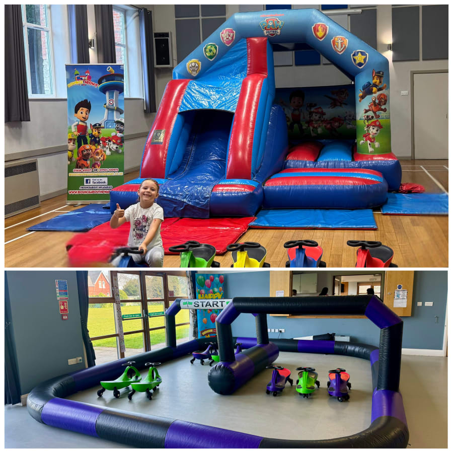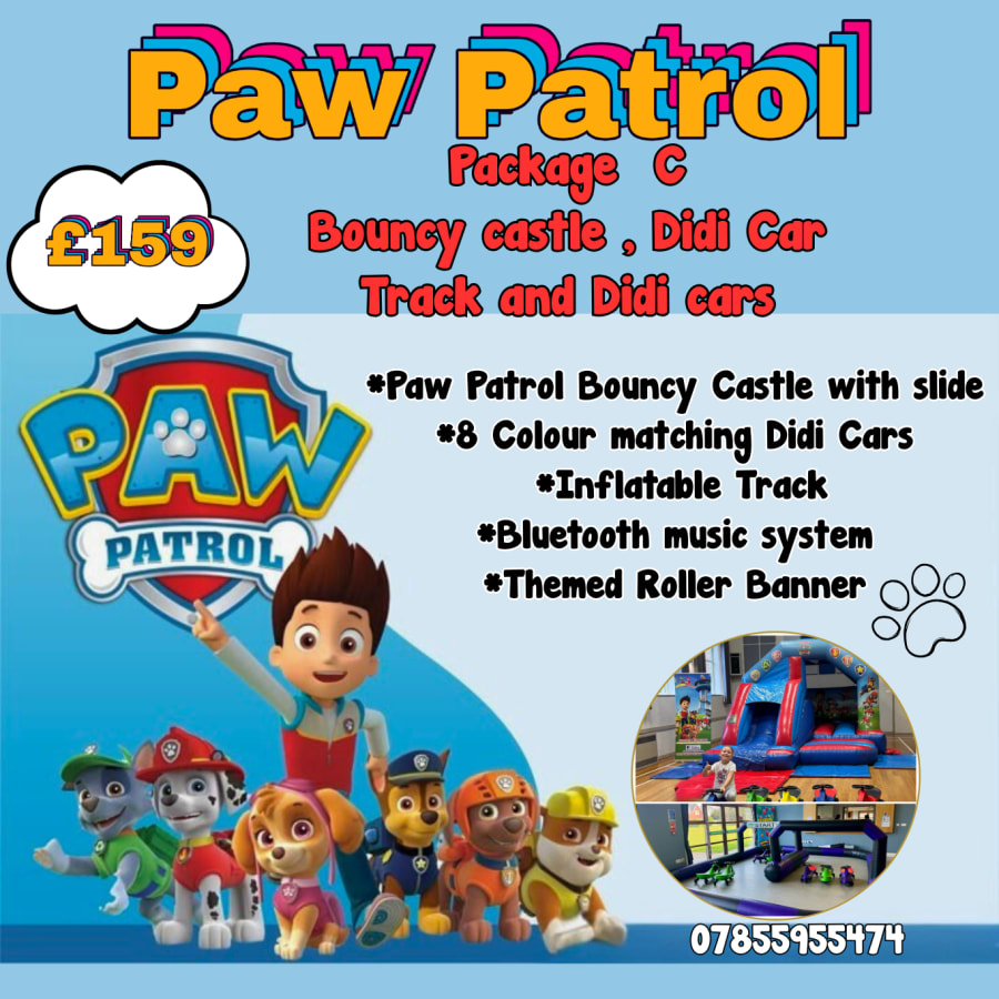 Secure a stress-free, high-energy kids’ party with our bouncy castle hire Package C with Track- Paw Patrol Castle, Didi Car Track and Cars with Blue tooth Music system in Newark, Balderton, Coddington, Farndon, Elston, Collingham, Winthorpe and local villages. 🎉 This all-in-one hire delivers themed bouncing, race-track fun and Bluetooth party music. Perfect for birthdays, family events and group play. 🐾🎶