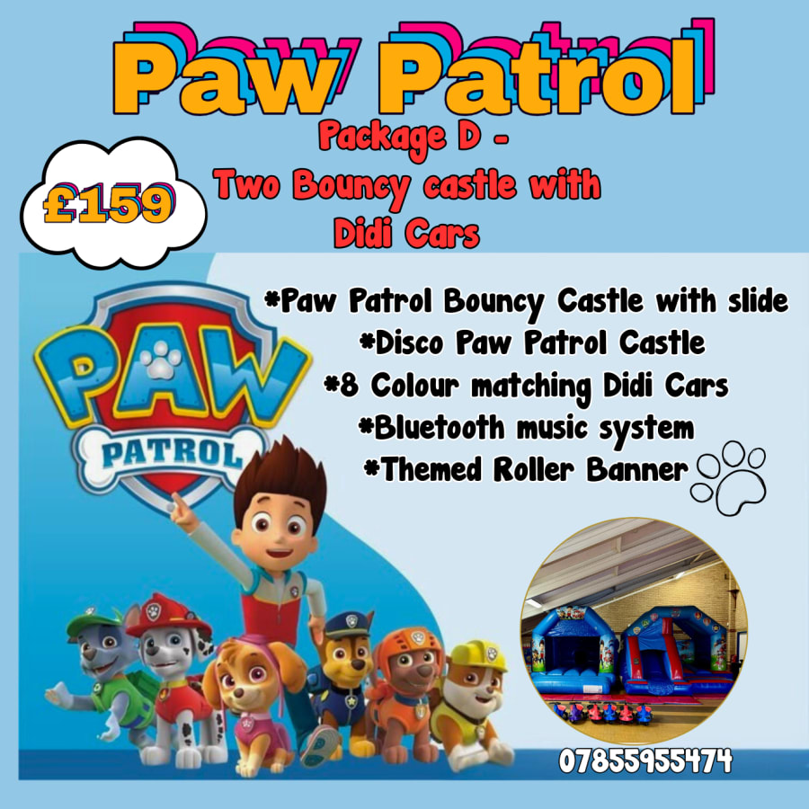 Package D- (Paw Patrol themed )Two bouncy castles and Didi cars