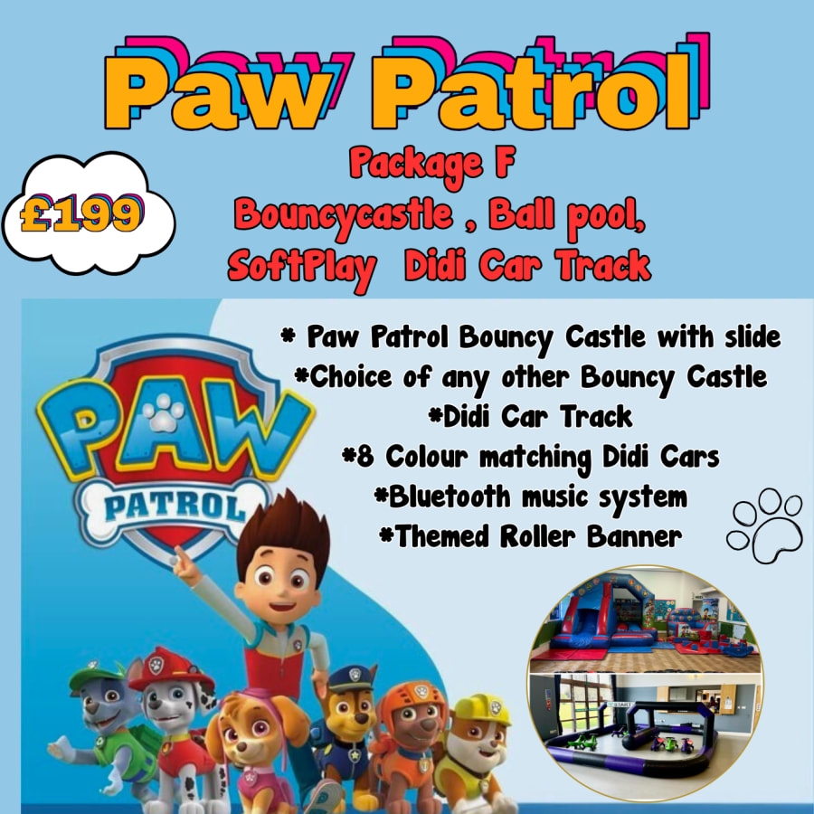 Bouncy castle party hire Package F- Paw PatrolBouncy Castle , Ball Pool with Soft Play, Bluetooth Music system, Inflatable Track and 8 Didi Cars in Newark, Balderton, Coddington and local villages delivers a complete, themed children’s party solution. This Paw Patrol themed set mixes high-energy play with safe soft play. Perfect for busy parents who want a memorable, stress-free event. 🎈