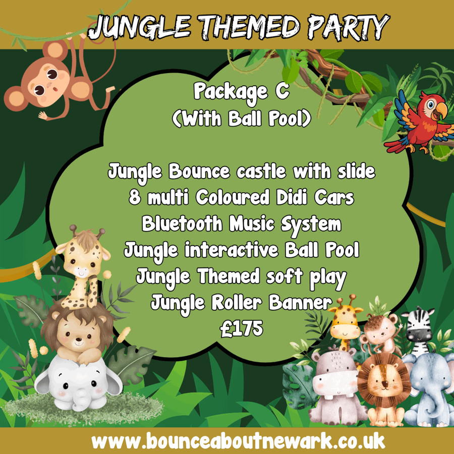 Reserve your Jungle Bouncy Castle and Soft Play Party Package now. Limited availability on weekends. Perfect for birthday parties, family gatherings, and community events. Contact us to check dates and confirm delivery in Newark and surrounding villages. Let the adventure begin! 🌟🐘