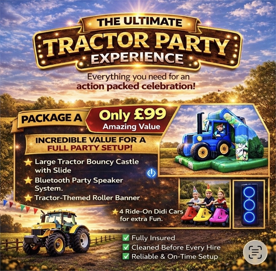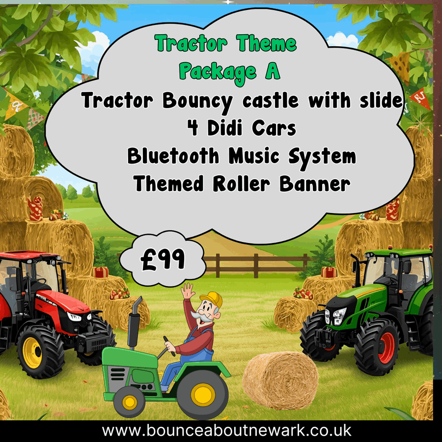 Make your child’s party unforgettable with our Tractor bouncy castle set. Bouncy castle hire for birthday parties Package B- Tractor Bouncy Castle with slide and 8 mini Didi Cars and music in Newark, 🚜🎉 Bluetooth music, a colourful themed banner and eight ride-on Didi cars keep kids active and happy.