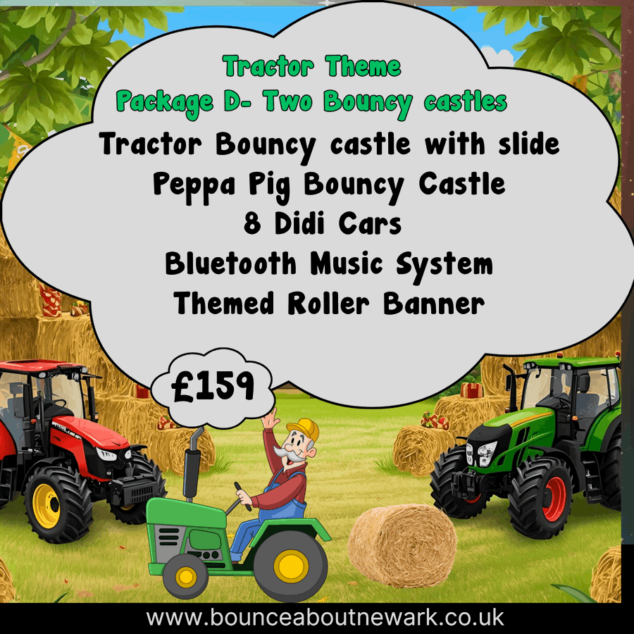 Bouncy castle hire for children birthday parties Package D- (Tractor and Farm themed )Two bouncy castles and Didi cars in Newark, Nottinghamshire, Lincolnshire