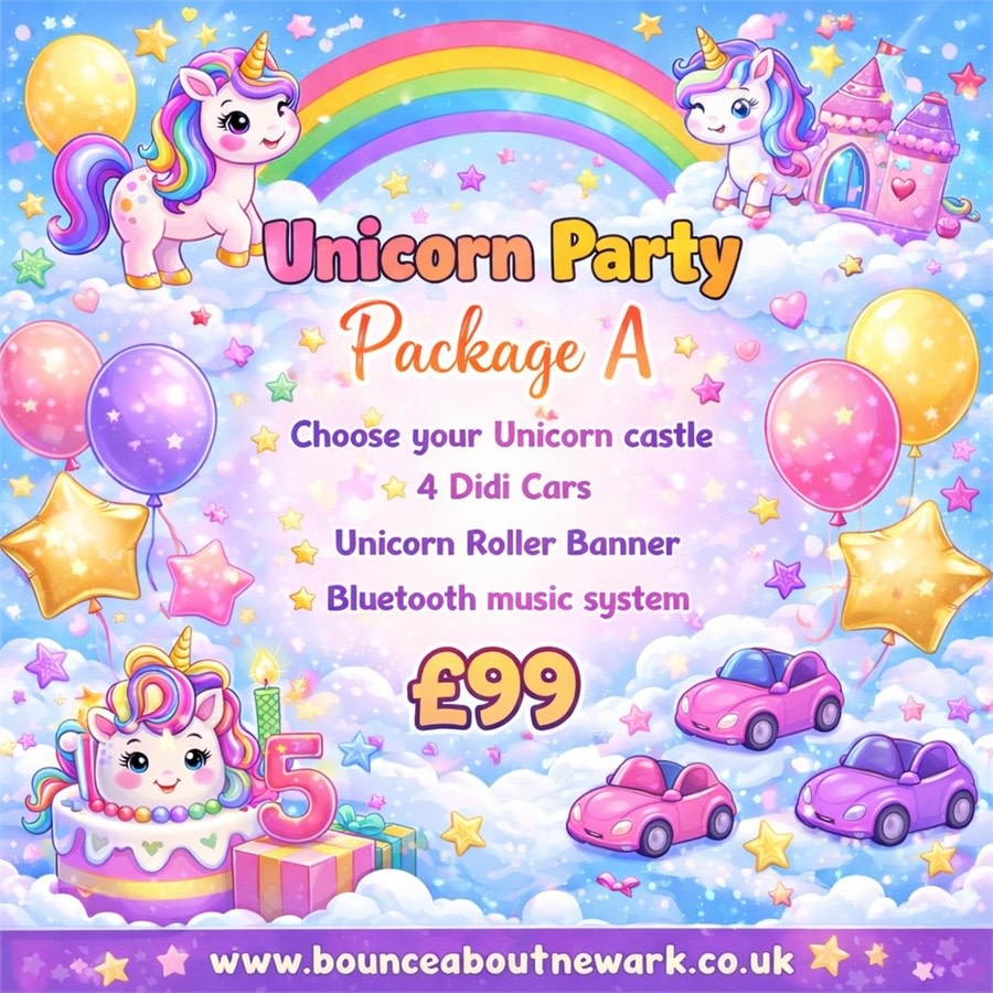 Bouncy castle hire for children parties Package A- Unicorn Bouncy Bouncy castle with slide Bouncy castle with Slide, 4 Didi Cars , Bluetooth Music System and Themed Roller Banner in Newark, Nottinghamshire, Lincolnshire. Book a colorfull unicorn-themed party set. Perfect for kids' birthdays, family events, and school fairs. Fast setup. Safe play. Memorable photos. 🦄📸