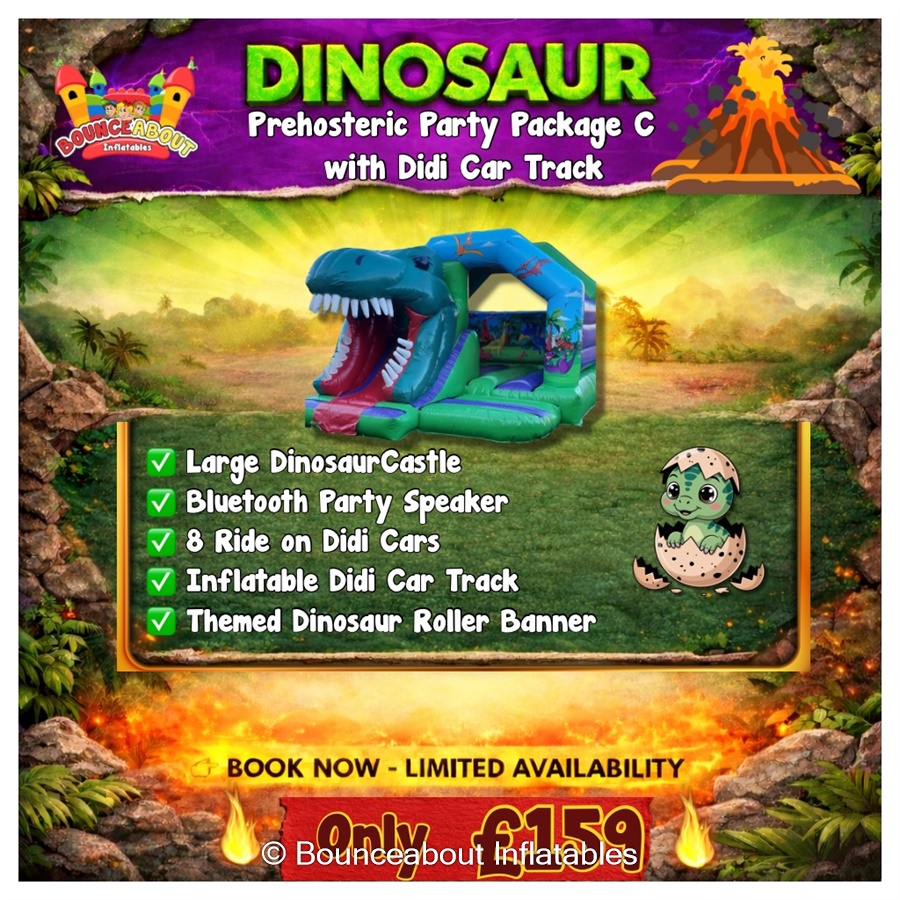 Available across Newark, Nottinghamshire, Lincolnshire. Reserve the Dinosaur Bouncy Castle Package C today to guarantee your date. Limited availability on weekends — book early to avoid disappointment. 📅🛒